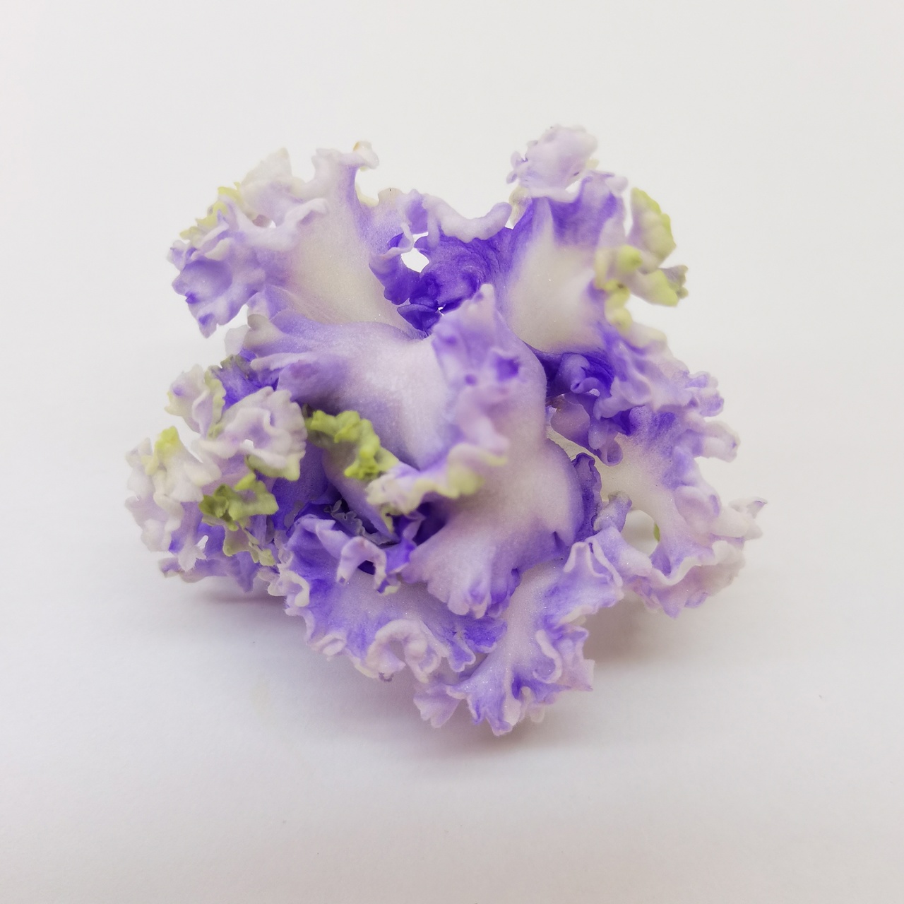 Розетка стандарт со светло-зелеными, зубчатыми, слегка волнистыми листьями. Цветок крупный, махровый, волнистым краем и зеленой рюшей.